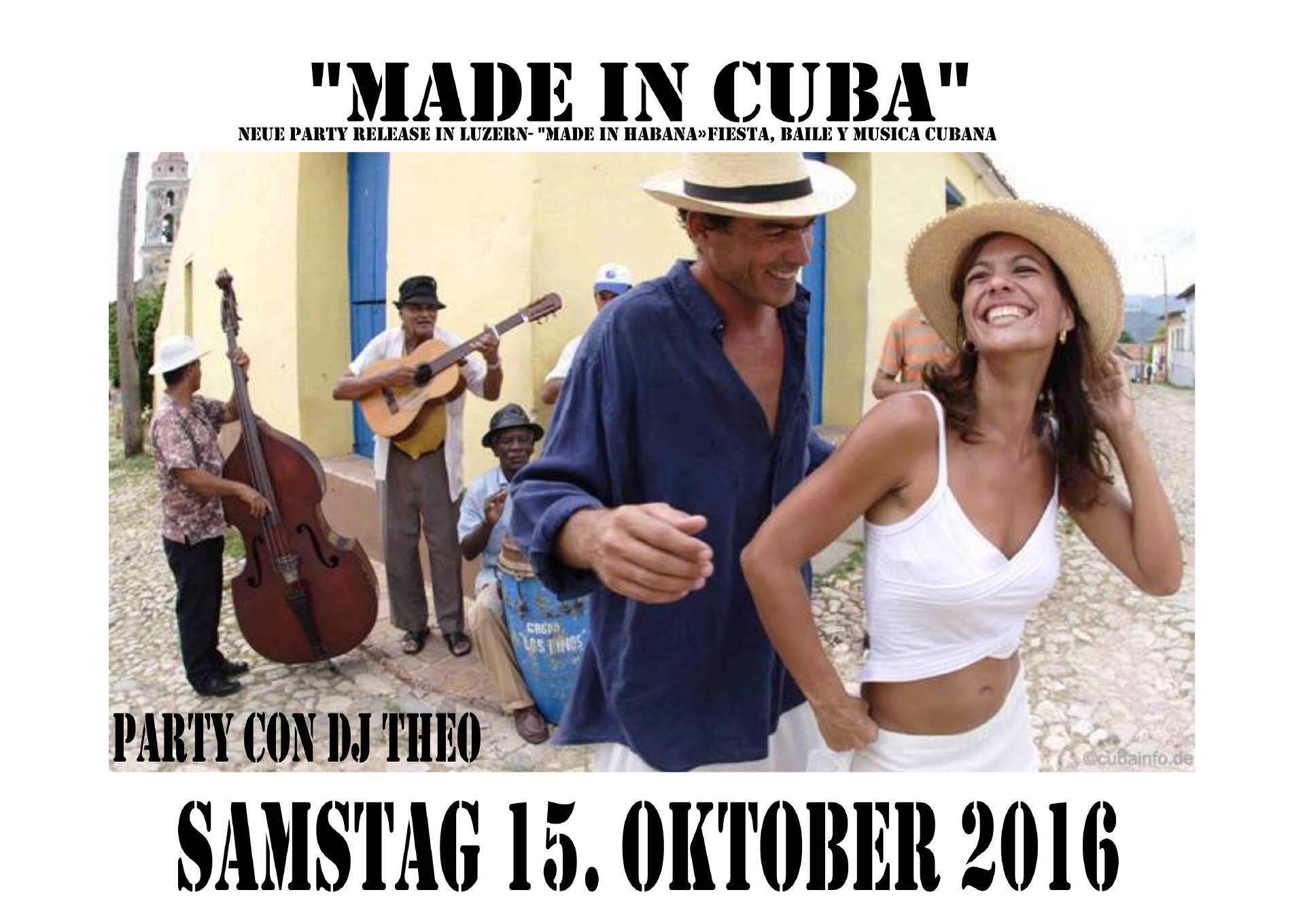 15 Okt DJ Theo Cuba Night SAMSTAG 15. OKTOBER 2016 NEUE PARTY RELEASE IN LUZERN"MADE IN CUBA" - "MADE IN HABANA"Fiesta, Baile y Musica CubanaParty con DJ TheoBAR "EL RINCON ARGENTINO" MOOSSTRASSE 15, 6003 LUZERN